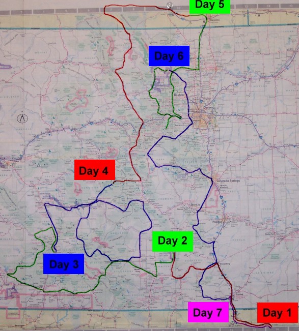 | This solo motorcycle trip to Colorado was meant to consist of touring some of the Colorado and Wyoming scenic routes by day while lodging in a tent at night. I traveled a total of 3260 miles while making tentative travel plans every night in camp for the next day. Clicking on each day on the map below will open information for that day in a new window. Each day's color code corresponds with the color of the highway traveled for that day. |